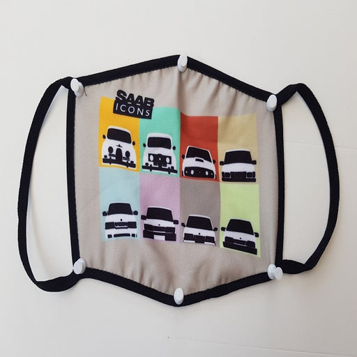 SaabiconsOriginal price £7.95Current price £5.96| /Dye sub Saab icons design comfort face mask. 2 layer microfibre polyester with a pocket for an extra filter if required.